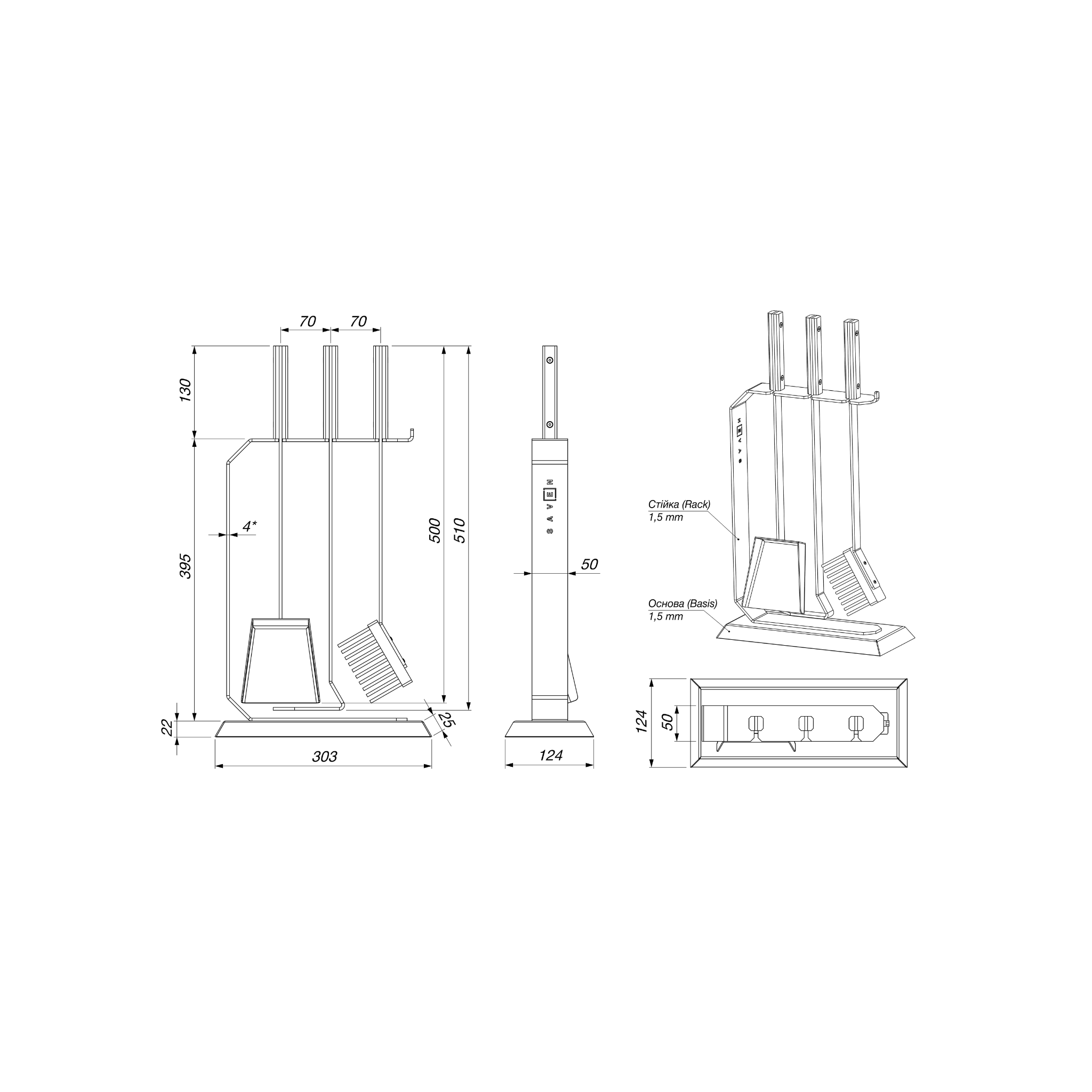 Komplekte yra trys įrankiai: šepetys, samtelis ir žarsteklis. Be to, stovą papildomai turi kabliuką skirtą pirštinėms, pirštinė NĖRA įtraukiama į komplektą – ją reikėtų įsigyti atskirai.