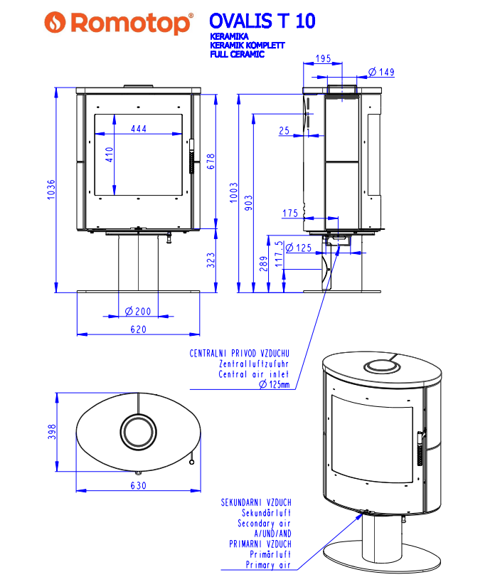 Romotop OVALIS T CERAMIC lenktas apvalus židinys - apvali krosnelė lenktu stiklu su keramikos apdaila / pasirink spalvą