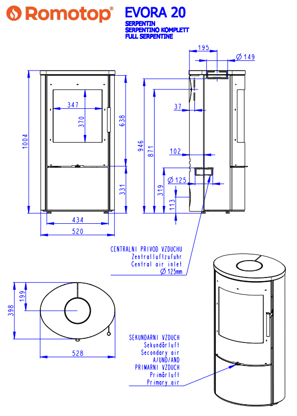 Romotop EVORA SERPENTINE lenktas apvalus židinys - apvali krosnelė su akmens apdaila