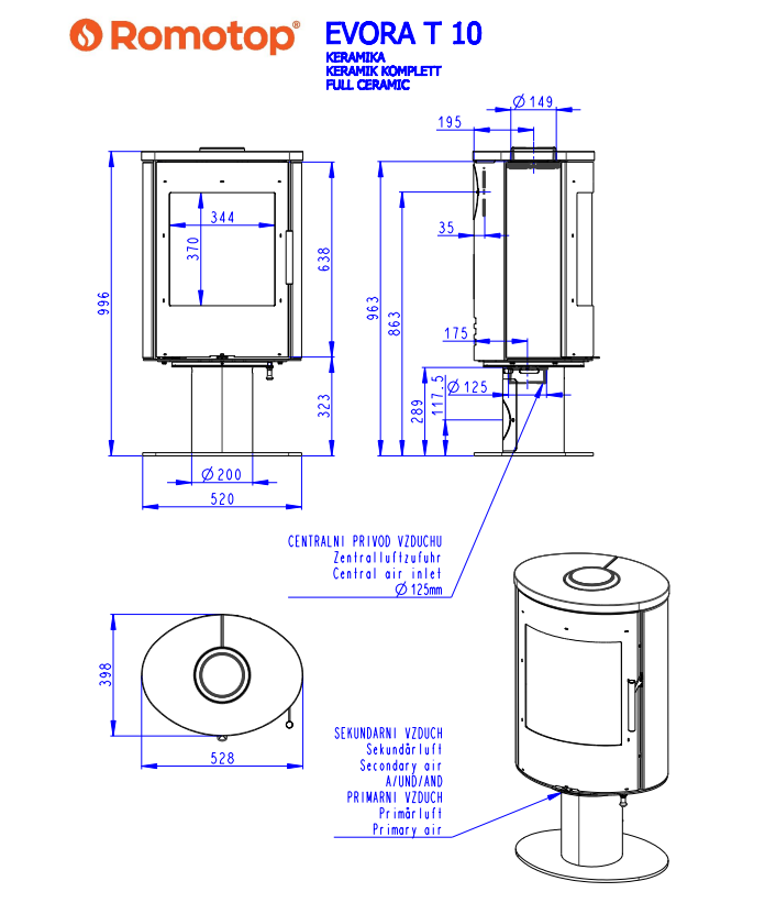 Romotop EVORA T CERAMIC lenktas apvalus židinys - apvali krosnelė su keramikos apdaila / pasirink spalvą