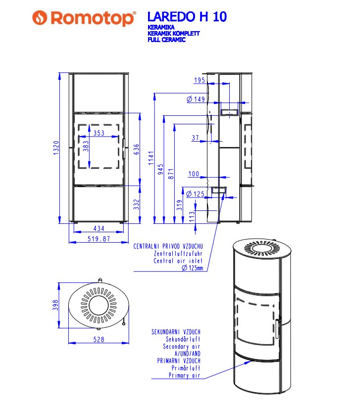 Romotop LAREDO H CERAMIC lenktas apvalus akumuliacinis židinys – apvali akumuliacinė krosnelė su keramika / pasirink spalvą