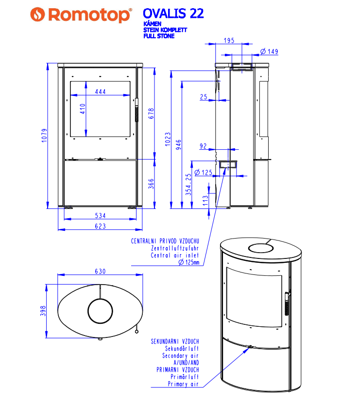 Romotop OVALIS SERPENTINE lenktas apvalus židinys - apvali krosnelė su akmens apdaila