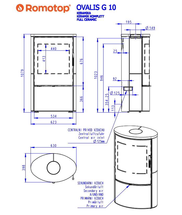 Romotop OVALIS G CERAMIC lenktas apvalus židinys - apvali krosnelė lenktu tonuotu stiklu su keramikos apdaila / pasirink spalvą