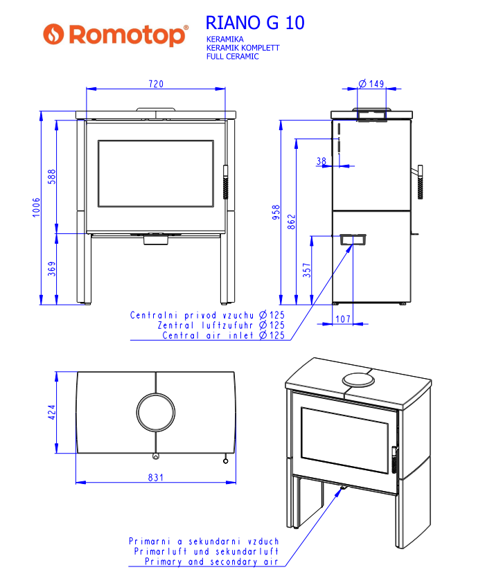 Romotop RIANO G CERAMIC židinys krosnelė su tonuotu stiklu ir keramikos apdaila / pasirink spalvą