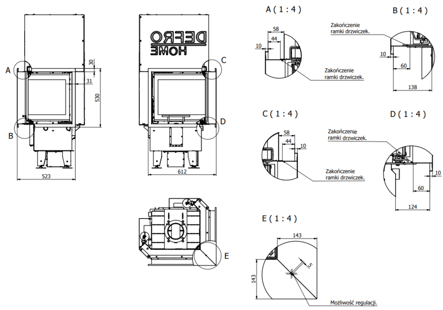 - Židinio kapsulė kampiniu dešinės pusės stiklu Defro Home Intra XSM BP MINI G pakeliamomis durelėmis.