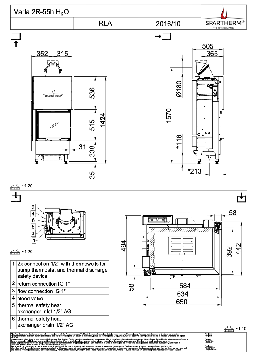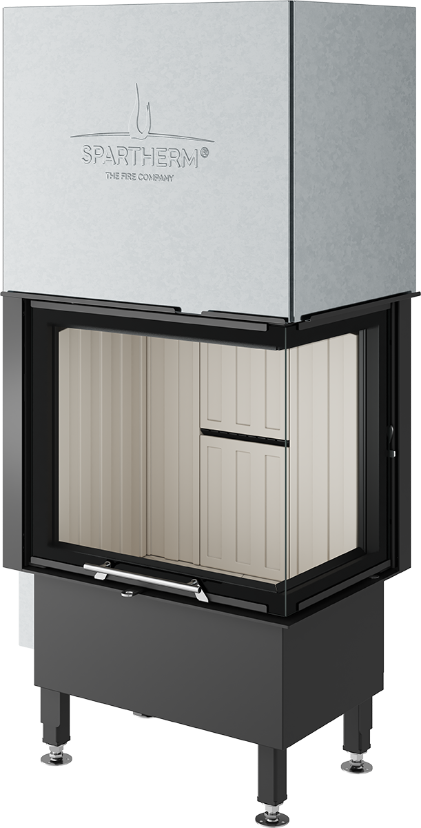 Spartherm Varia 2R-55h H₂O kampinis židinys su pakeliamu stiklu ir vandens kontūru. Kampinė židinio kapsulė su šilumokaičiu ir į viršų pakeliamu stiklu.