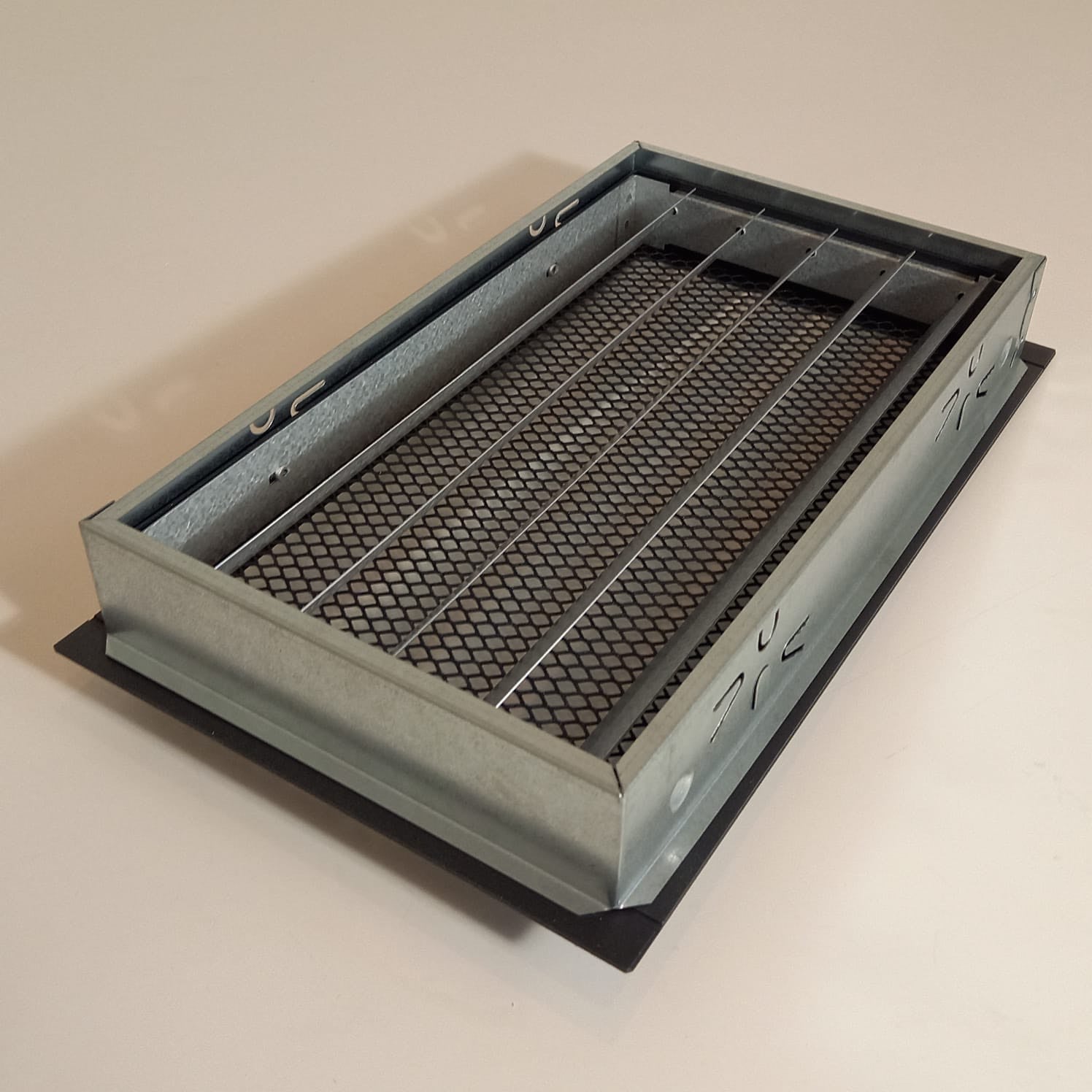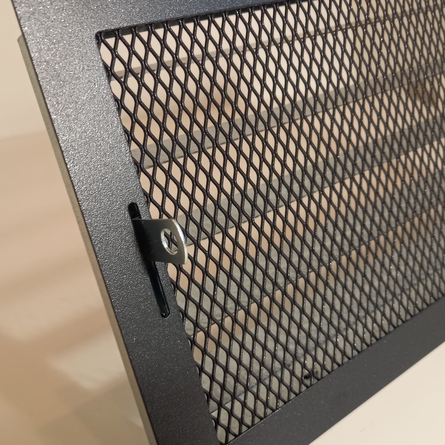 Juodos (antracitas) grotelės su žaliuzėmis židiniams 180 x 180 mm. Tiesios židinio grotelės su žaliuzėmis ir montavimo lizdu