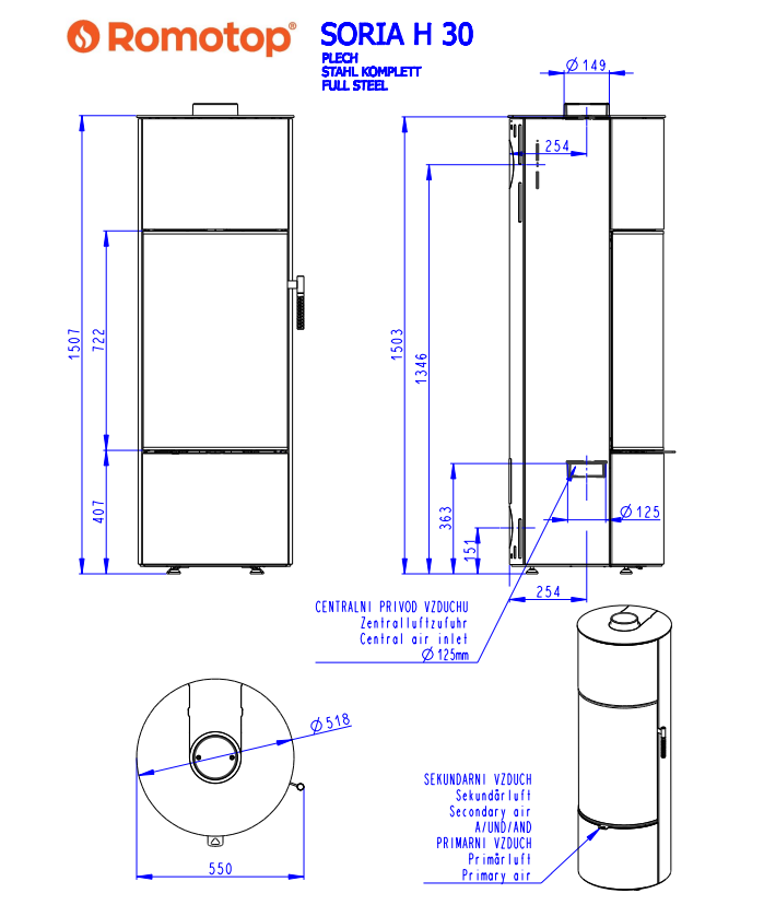 Romotop SORIA H STEEL lenktas apvalus akumuliacinis židinys – apvali akumuliacinė krosnelė
